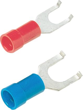 Isoleret gaffelkabelsko A1543GB til 0,5-1,5mm² Cu-leder med laske M4. Fremstillet af fortinnet elektrolyt kobber med polycarbonat isolering.