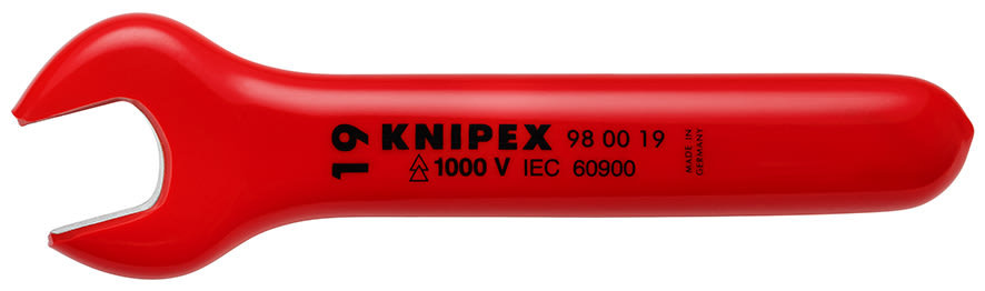 VDE-godkendt gaffelnøgle fra Knipex med nøglestilling 15°. Forkromet grundværktøj. Nøglestørrelse: 19mm. Længde: 165mm.