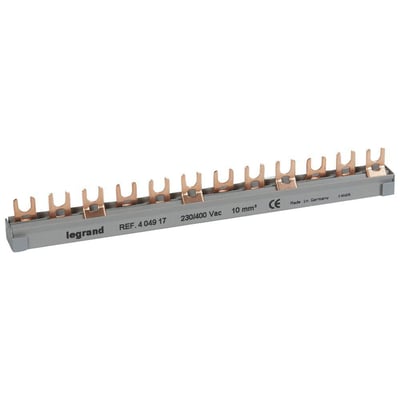 3-polet Legrand gaffelsløjfeskinne (uden nul) til fasefordeling på 3 faser. Til max 6 komponenter, længde 21,4 cm. Kan afkortes. Endestykker sælges separat.
