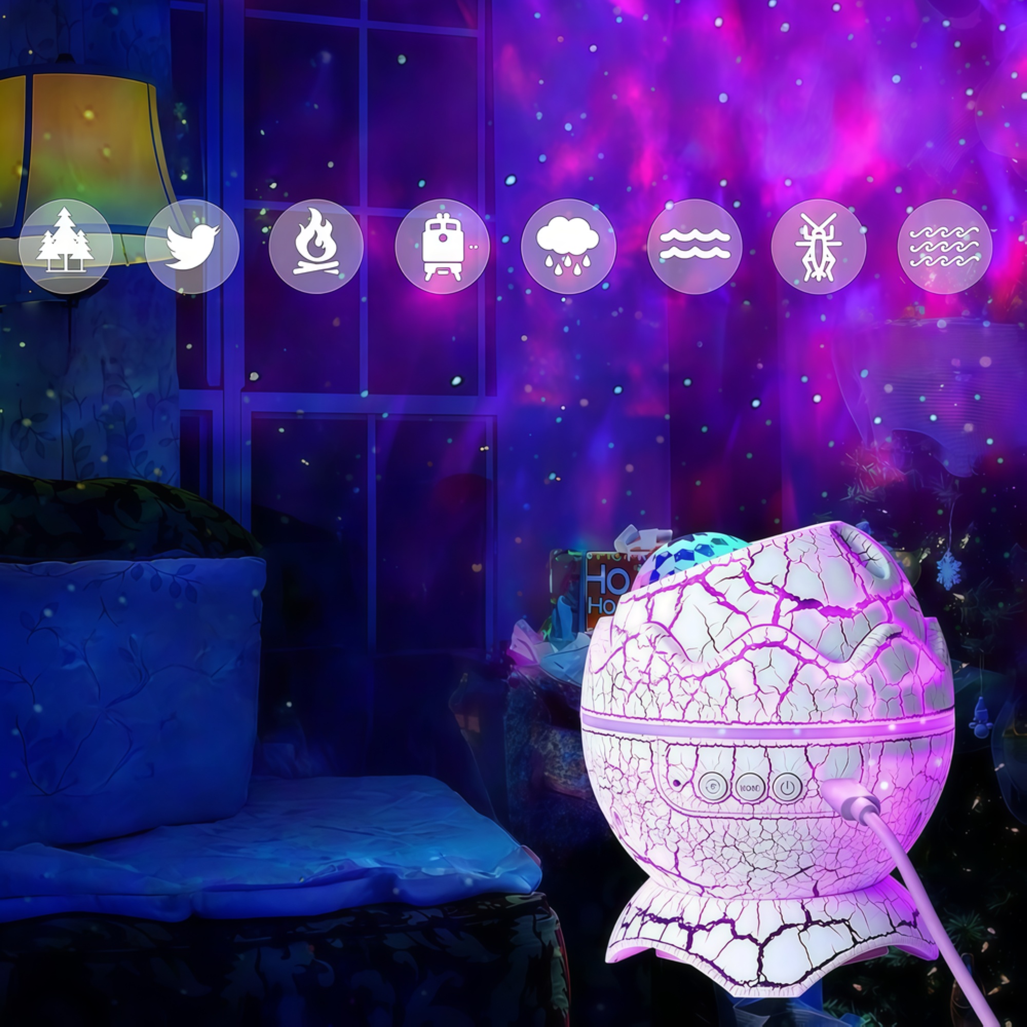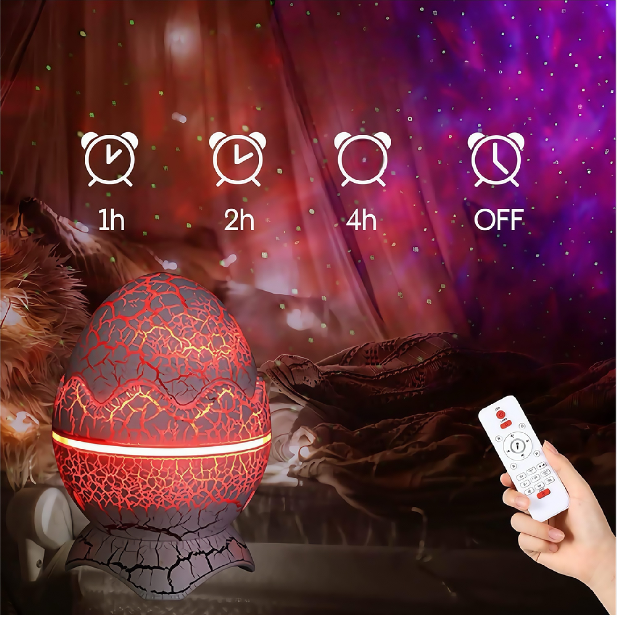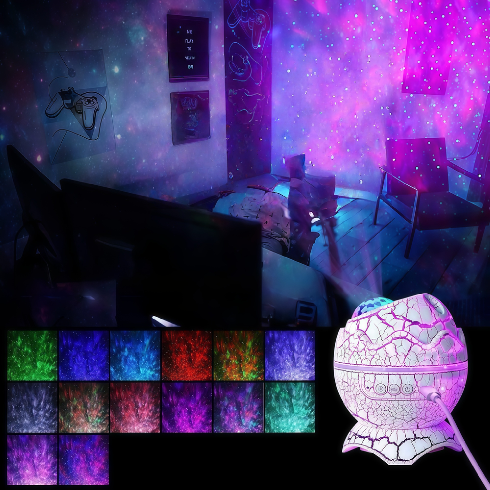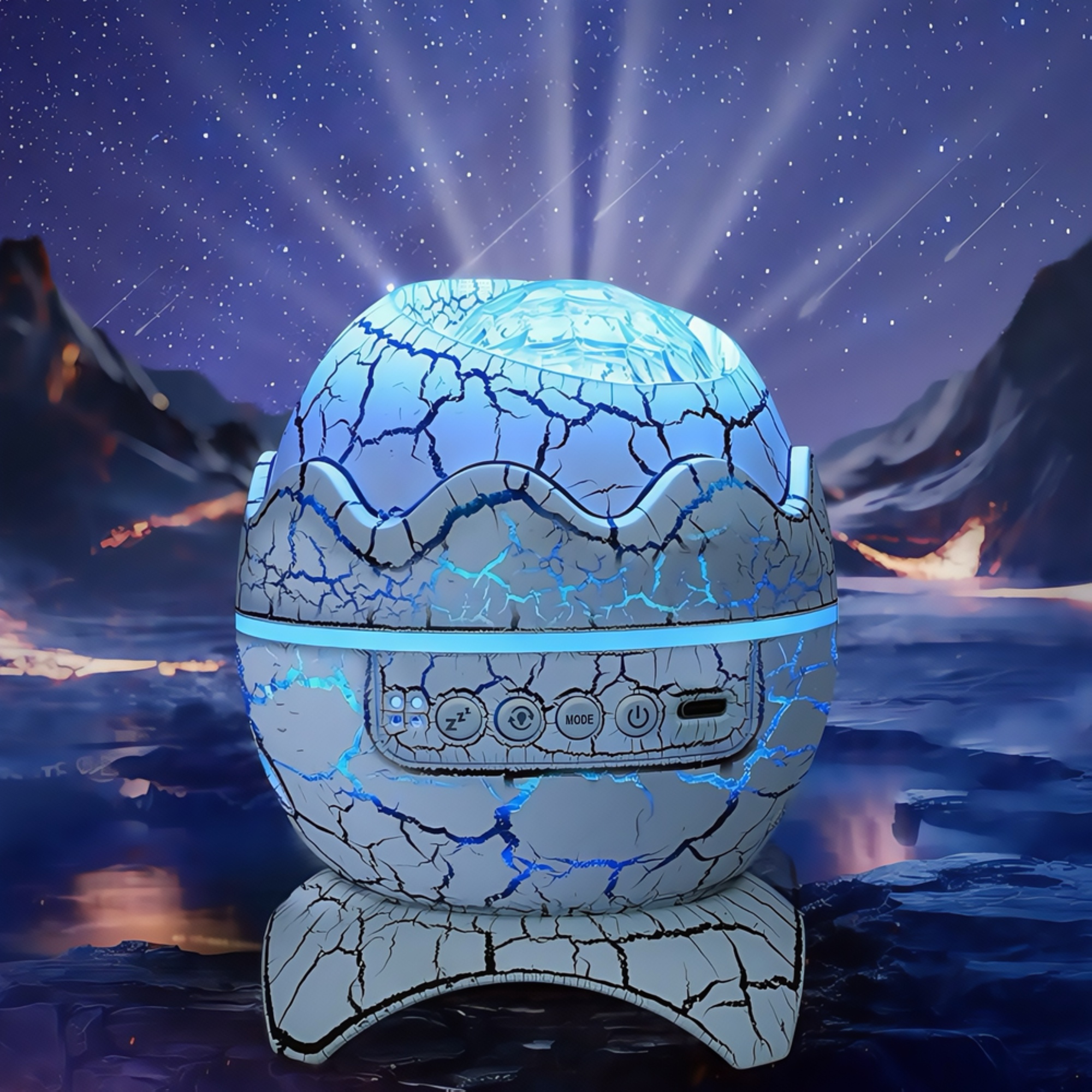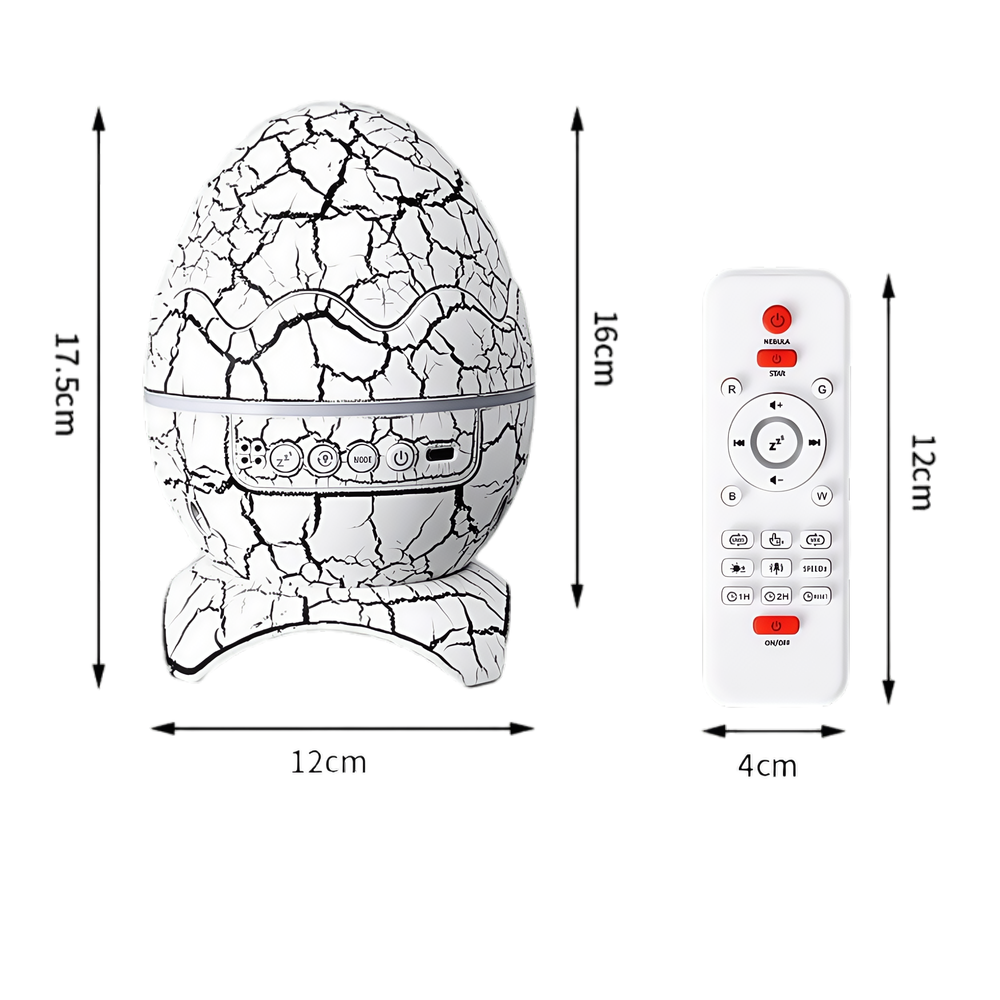 Oplev en stjerneklar nat i dit eget hjem med denne unikke galakse projektør formet som et dinosaur æg. Projektøren skaber en betagende atmosfære med lysende galakser og stjerner, der danser hen over loftet og væggene.