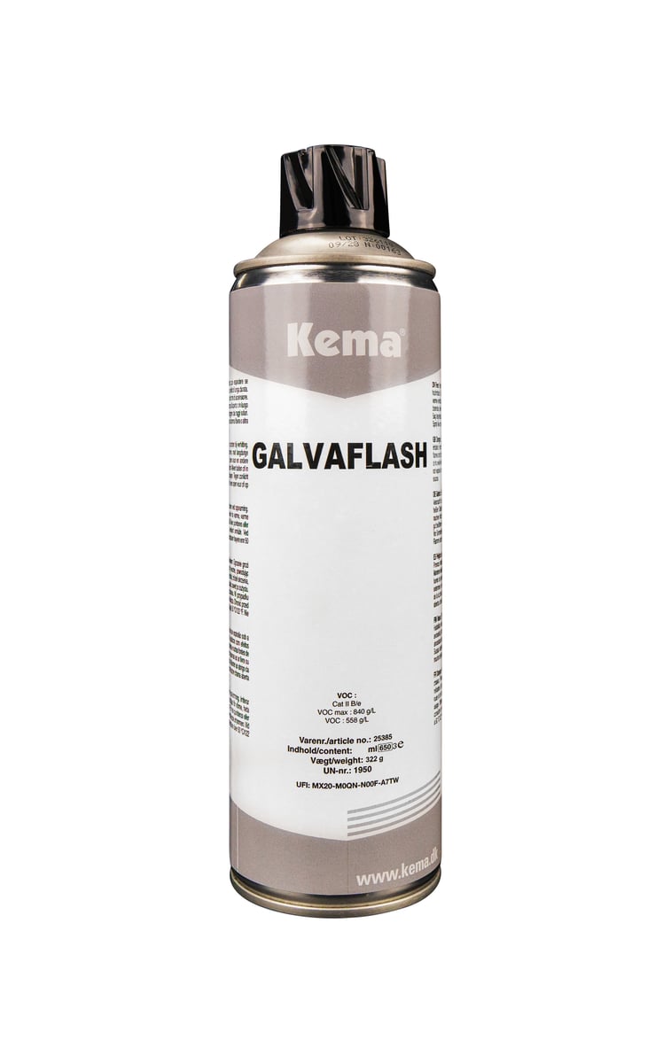 Kema Galva Flash spray giver en blank og skinnende aluminiumsoverflade på metal. Beskytter mod korrosion og er varmebestandig op til +450 °C.