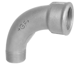 Blødstøbt fitting af støbejern. Har indvendigt gevind i begge ender samt en vinkel på 90°. Bøjningen har en stor radius.