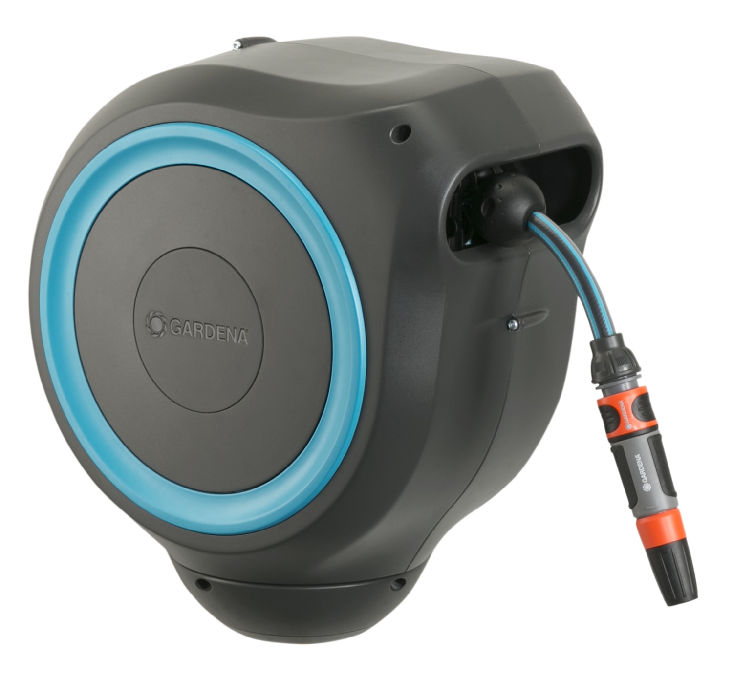 Praktisk og kompakt vægslangeboks fra Gardena med 15 meter slange. Automatisk oprulning og nem opbevaring.