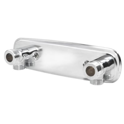 Dette vægfæste er designet til vægmonterede armaturer med en center-til-center afstand på 150-153 mm. Det er udført i krom og passer til udvendige rør med en diameter på 12 og 15 mm.