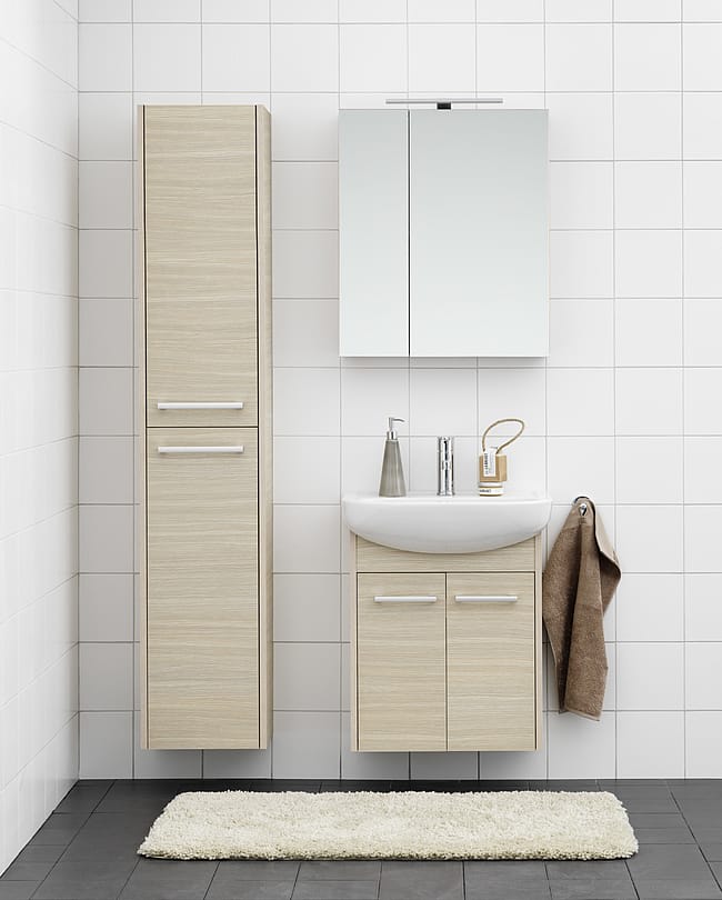 Skabets overflade i eg-melamin giver et flot og naturligt udseende, der passer godt ind i de fleste badeværelser. Materialet er slidstærkt og nemt at rengøre, hvilket sikrer, at skabet holder sig pænt i mange år.