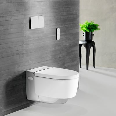 Geberit AquaClean Mera Comfort douchetoilet med mange funktioner som justerbar vandtemperatur, lugtudsugning, tørrer, toiletsæde med varme og soft close.