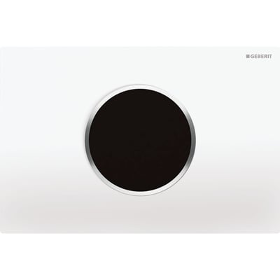 Geberit Sigma10 betjeningsplade med elektronisk WC-skyllestyring, netdrift og dobbeltskyl. Berøringsfri/automatisk, i hvid og blankforkromet finish.
