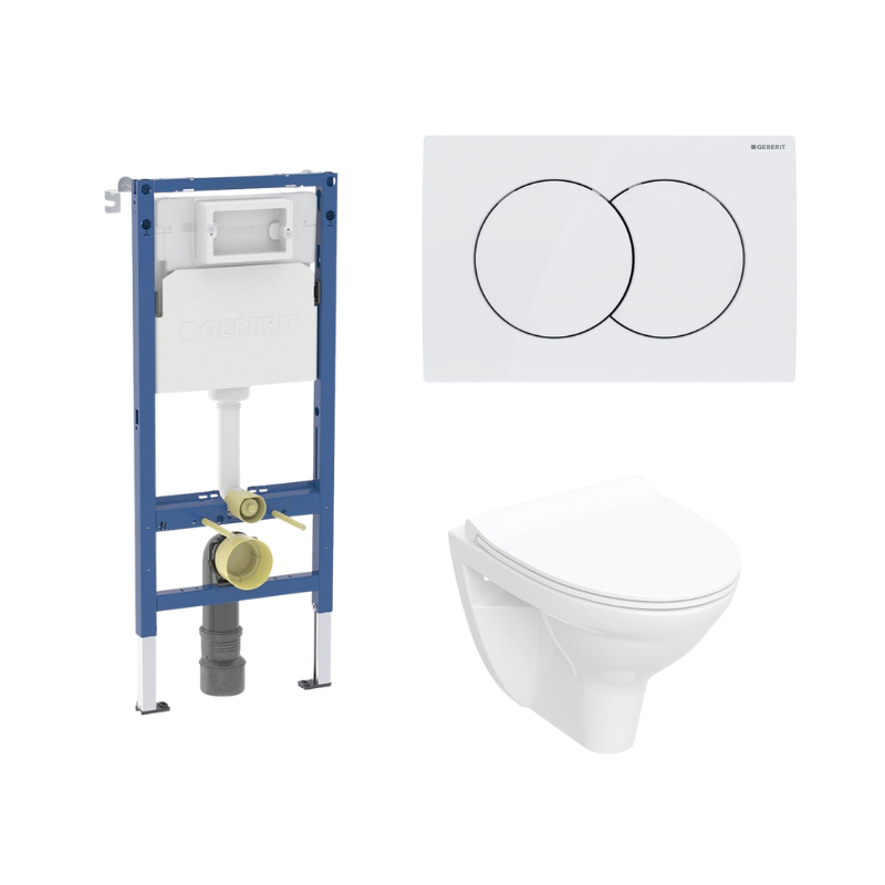 - Komplet løsning: Indeholder Duofix element, Delta indbygningscisterne, Delta01 trykplade (krom/blank) og Geberit Selnova væghængt toiletskål med SoftClose sæde.
