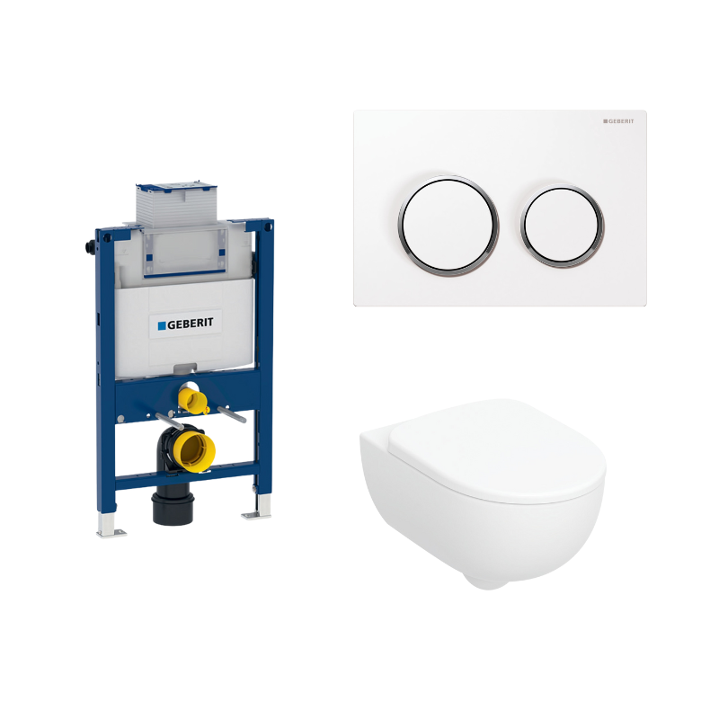 Denne komplette toiletpakke fra Geberit kombinerer det stilrene Geberit Selnova væghængte toilet med en Duofix Omega indbygningscisterne på 82 cm. Pakken inkluderer et blødtlukkende toiletsæde (SoftClose) og en elegant Omega20 round trykplade i hvid med krom detaljer.