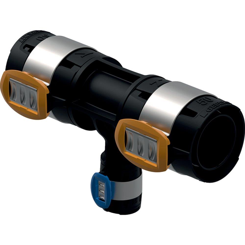 Dette FlowFit T-stykke fra Geberit er fremstillet i sort PPSU (Polyphenylsulfon) og er designet til sikker og effektiv sammenføjning af rør.