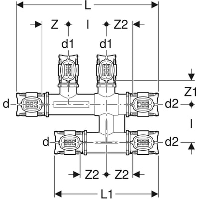Dette Geberit FlowFit kryds-T-stykke er designet med en blå isoleringsboks og fremstillet i blyfri siliciumbronze (CuZn21Si3P). Kryds-T-stykket har dimensionerne d=20 mm, d1=20 mm og d2=20 mm.