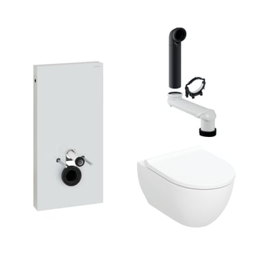 Denne komplette toiletpakke fra Geberit indeholder alt, hvad du behøver for at installere et moderne og stilrent væghængt toilet. Pakken inkluderer Geberit Monolith cisternemodulet på 101 cm med et elegant frontpanel af sort glas, det væghængte Geberit Acanto toilet med dertilhørende toiletsæde, samt en variabel afløbsbøjning for nem installation.