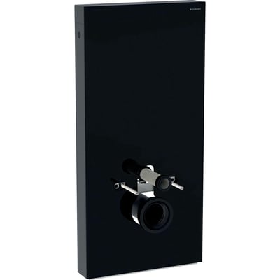 Geberit Monolith cisternemodulet er designet til væghængte toiletter og tilbyder en elegant og funktionel løsning til badeværelset. Modulets frontpanel er udført i sort glas, mens sidepanelerne er i børstet aluminium med sort krom finish, hvilket giver et moderne og stilrent udtryk.