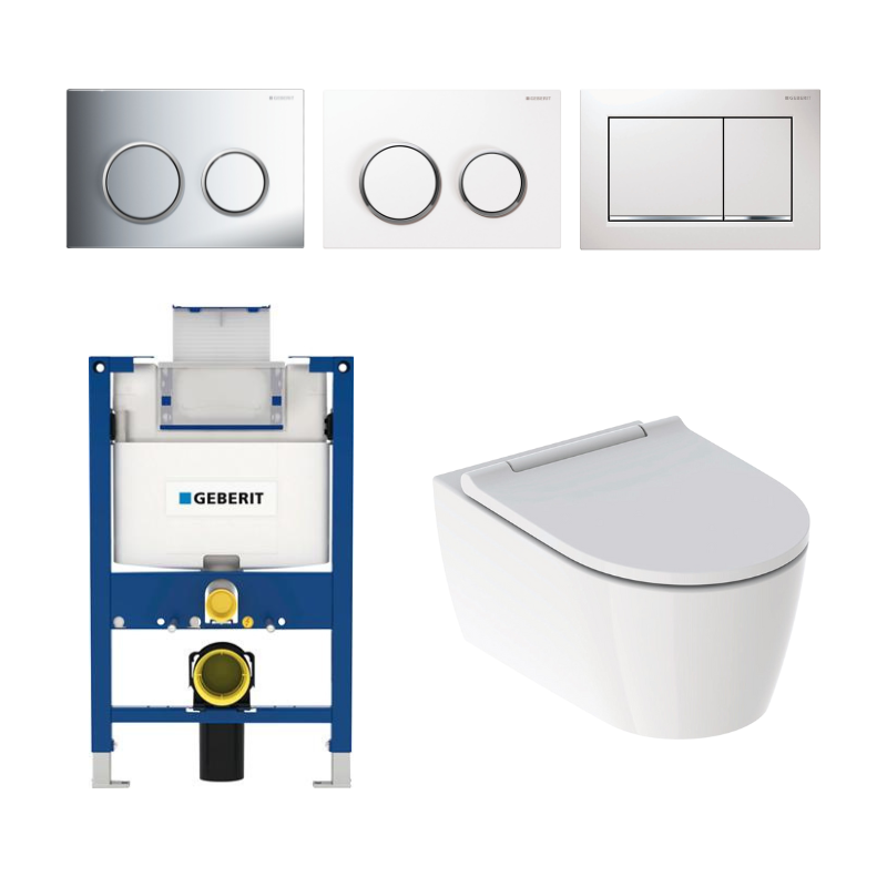 Byg selv toiletpakke! Pakken består af en Omega indbygningscisterne i 82 cm til betjening oppefra. Herefter er valget dit. Vælg mellem 3 skåle+sæder + 3 betjeningsplader!