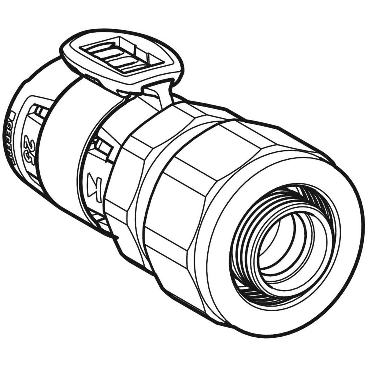 Geberit FlowFit overgang med union til PEX-rør. Fremstillet i CuZn21Si3P, d=25 mm, PN=6 bar og med DVGW drikkevandsgodkendelse.