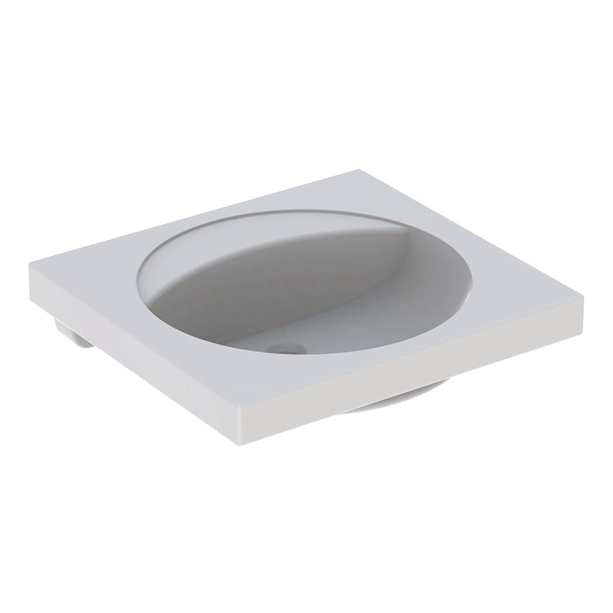Elegant Geberit Preciosa håndvask i hvid porcelæn med KeraTect overflade. Mål: 600x550x200mm. Designet uden hanehul og overløb.