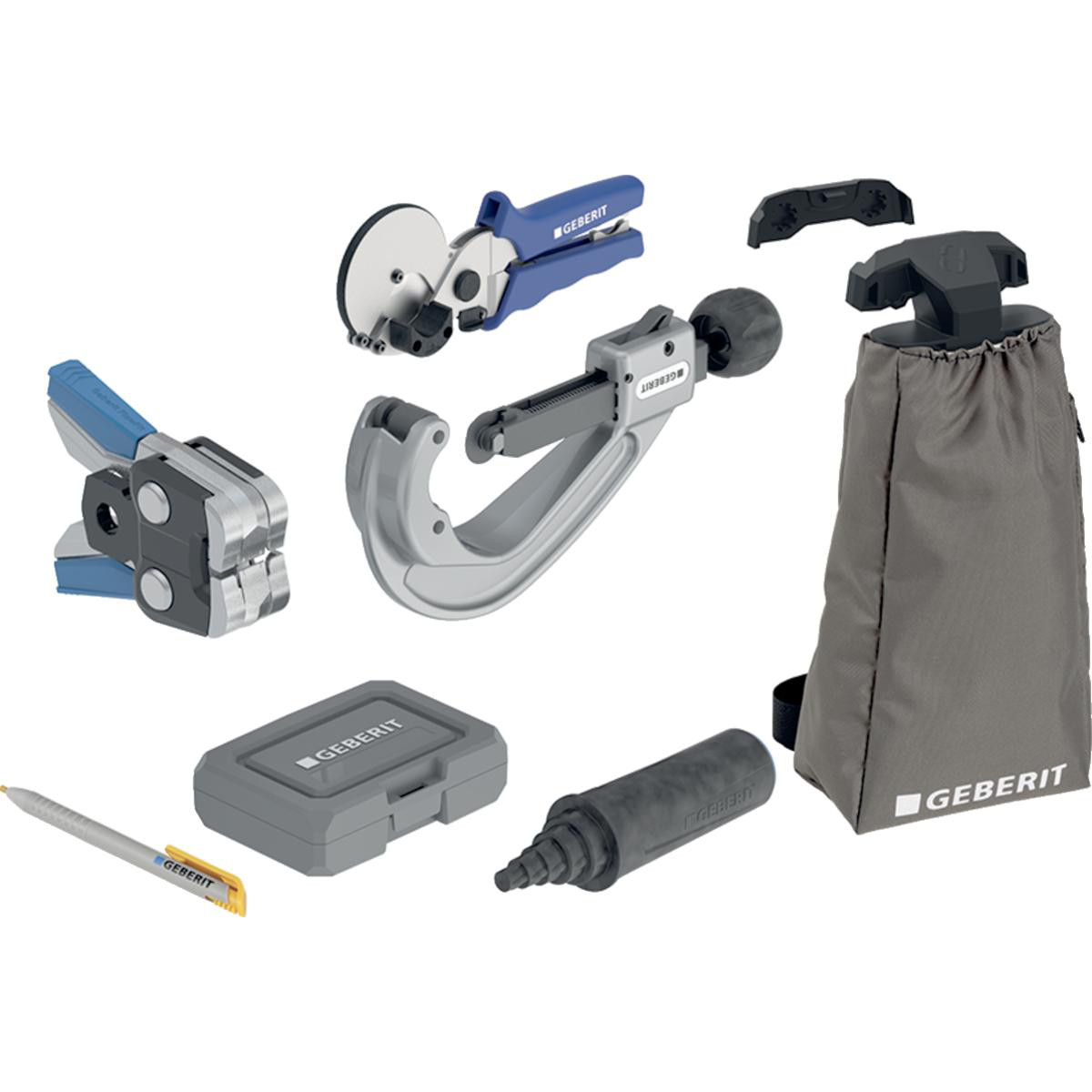Geberit FlowFit sæt med pressekæbe: d=16 / 20 / 25 / 32 / 40mm. Sættet er vedligeholdelsesfrit og kan betjenes med én hånd. Forzinket og egnet til funktionstest med PowerTest.