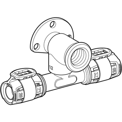 Geberit FlowFit T-tilslutningsvinkel 90° forskudt: CuSn4Zn2PS, d=20 mm, Rp=1/2, d1=20 mm, L=5,2 cm. Fremstillet i blyfri messing.