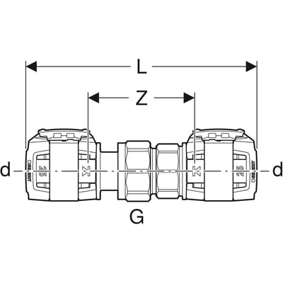 Geberit FlowFit union: CuZn21Si3P, d=40 mm. Fremstillet i blyfri siliciumbronze og med DVGW drikkevandsgodkendelse.