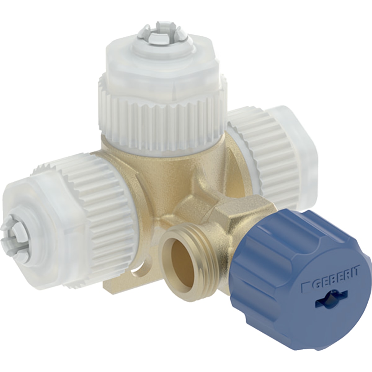 Geberit Duofix 3-vejs vandtilslutning til PEX-rør med integreret vinkel stopventil, beregnet til cisterne.