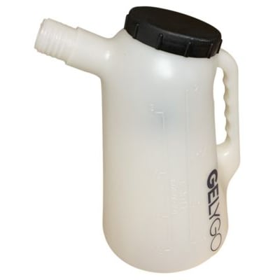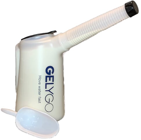 Gennemsigtig doseringskande i polyethylen med aftagelig tud og opøserskovl, designet til nem og præcis dosering af 1,5 kg GelyGo granulat.