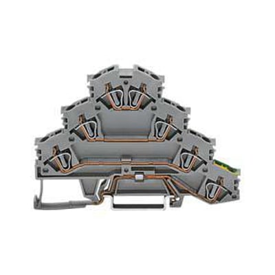4-etagers rækkeklemme med midter- og sidepåskrift, L1 - L2 - L3 - PE, TS 35, front-ledningsføring og CAGE CLAMP-tilslutning i vinklet design.