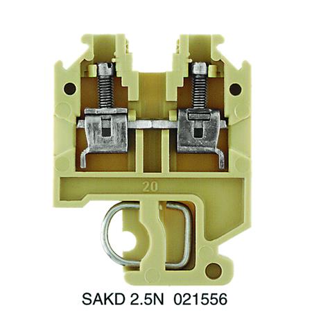 Gennemgangsklemme type SAK 2.5 PA med skrueterminal til TS32 DIN skinne. Tilslutning: 0.5 - 2.5 mm². Spænding: 800 V. Strøm: 24 A.