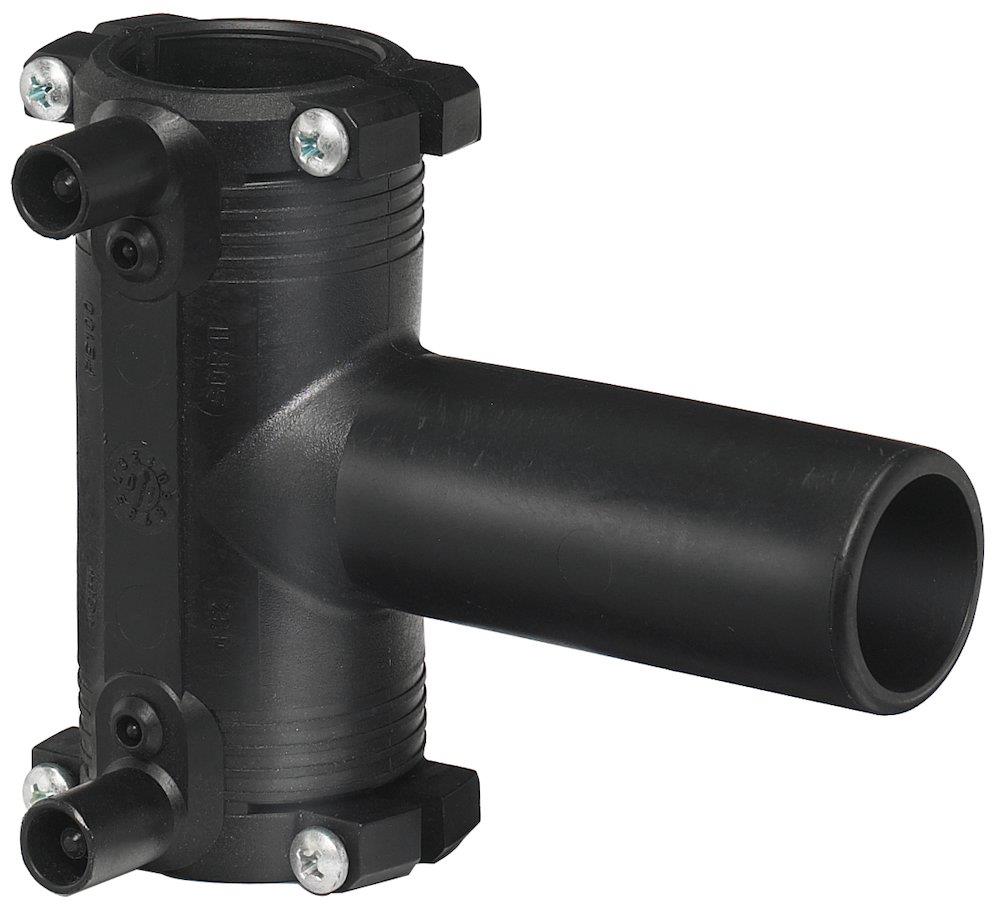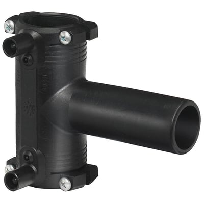 ELGEF Plus svejsetee i PE100. Anvendes til gas (maks. 10 bar) og vand (maks. 16 bar). Med 4 mm stik og svejseindikator.