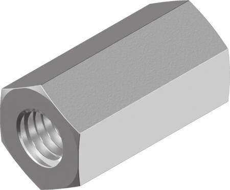 Gevindmuffe til samling og forlængelse af gevindstænger. A4 rustfrit stål, sekskantet design.