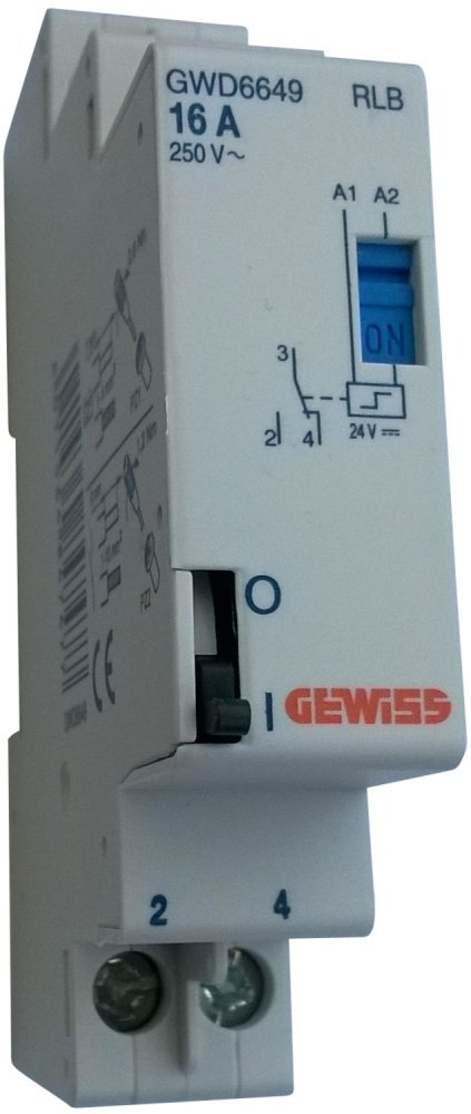 Kiprelæ fra Gewiss med 1 skifte, 16A, 24V DC og fylder 1 modul i tavlen.