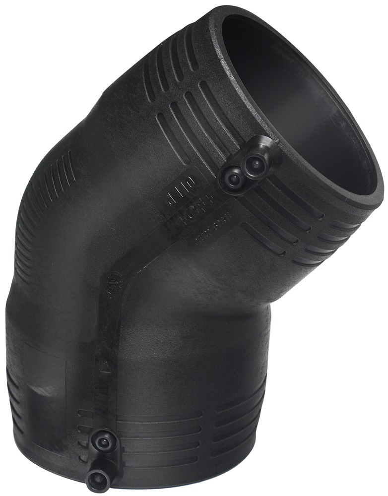 GF ELGEF Plus el-vinkel i PE100 til gas og vand. Dimensioner: 180 mm, 45°, SDR11, PN16. Modulopbygget system for fleksible kombinationer.