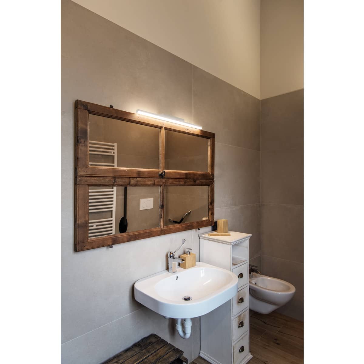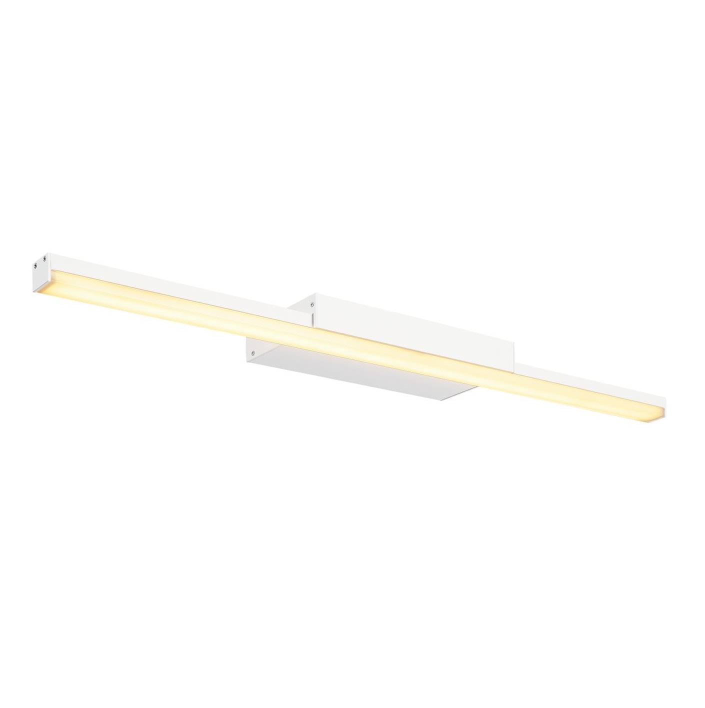 Elegant og slank spejllampe fra SLV med højtydende LED-strip. Justerbar lysfarve (3000K/4000K) via CCT-switch. Blændfri belysning. Til montering over spejlet.