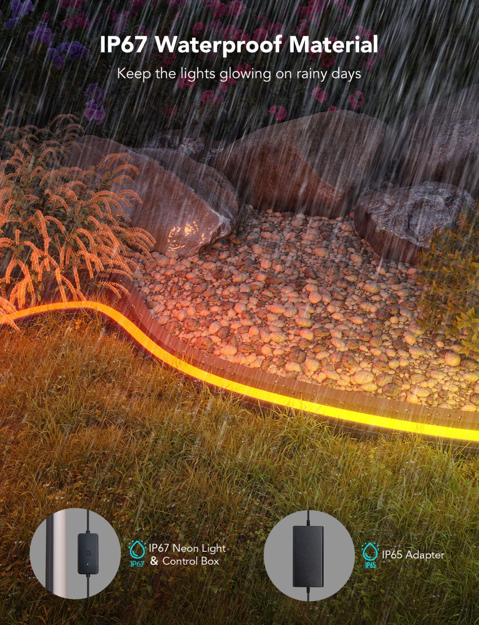 - IP67 Vandtæt Design: Lysstrippen har en IP67-klassificeret kontrolboks og en IP65-klassificeret adapter, der sikrer holdbarhed i udendørs miljøer.