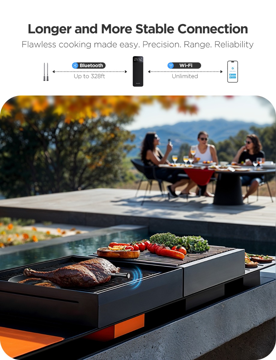 Med en fødevaregodkendt, vandtæt probe, der kan måle både interne og eksterne temperaturer fra 0°C til 300°C, leverer dette stegetermometer en nøjagtighed på ±1°C med opdateringer hvert 3. sekund.