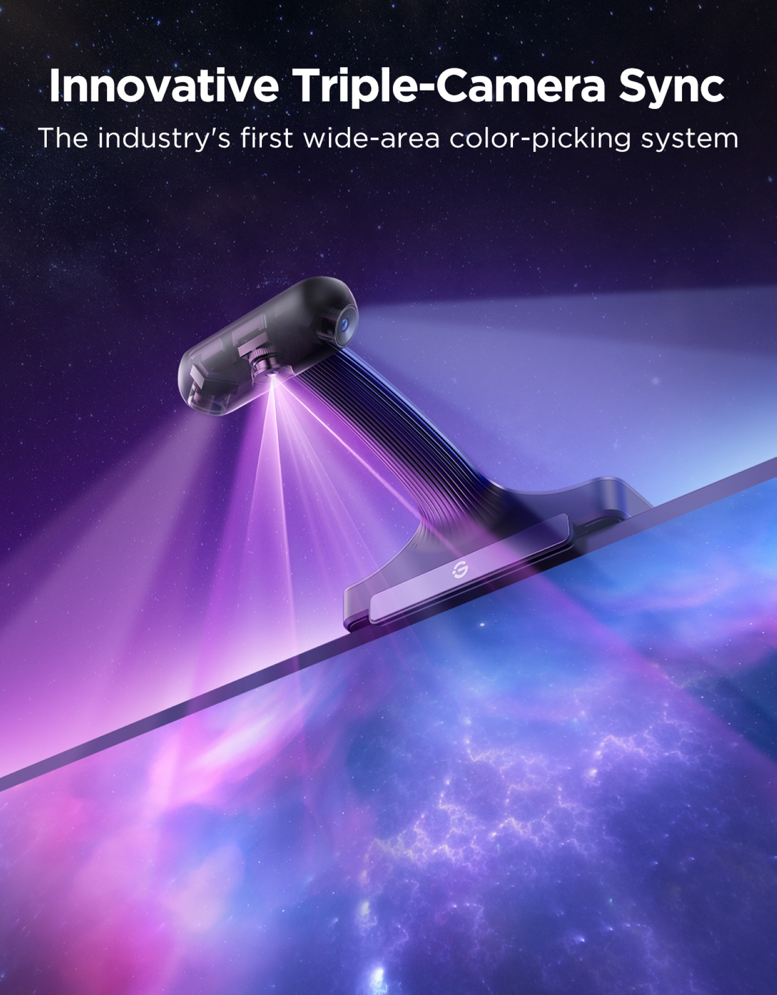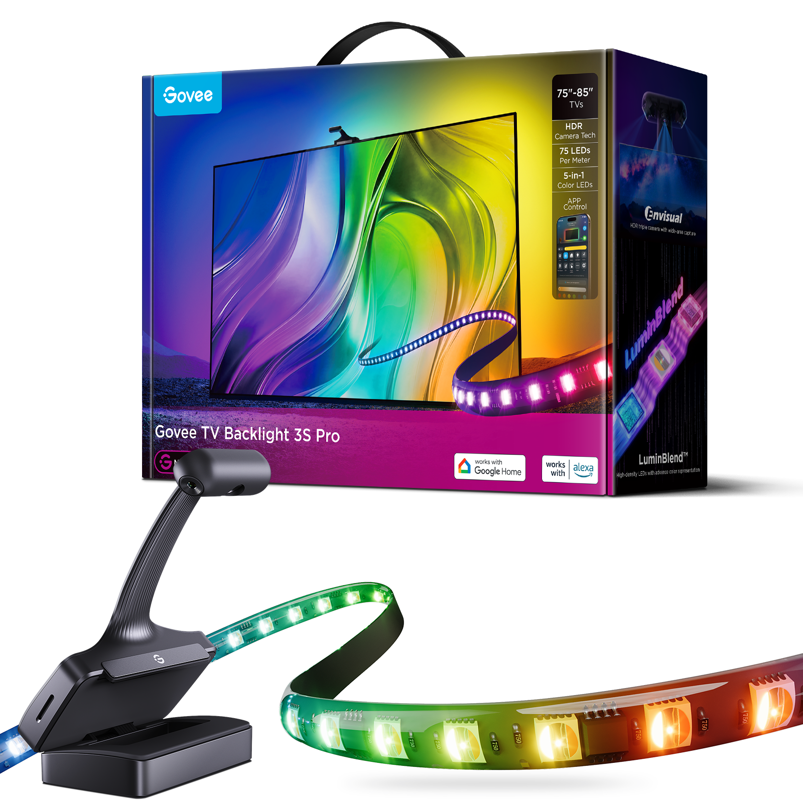 Govee TV Backlight 3 Pro for 75-85 inch TVs. Advanced HDR triple-camera system for precise colors and smart zone adaptation. 16-bit color accuracy and DreamView sync.