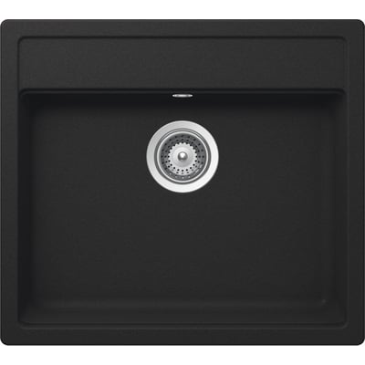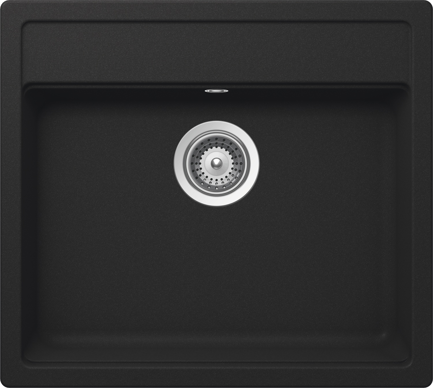 Menorca 60 er en elegant enkeltkumme i sort komposit (granit) til nedfældning, med kurveventil og hanehul. Mål: 570x510 mm.