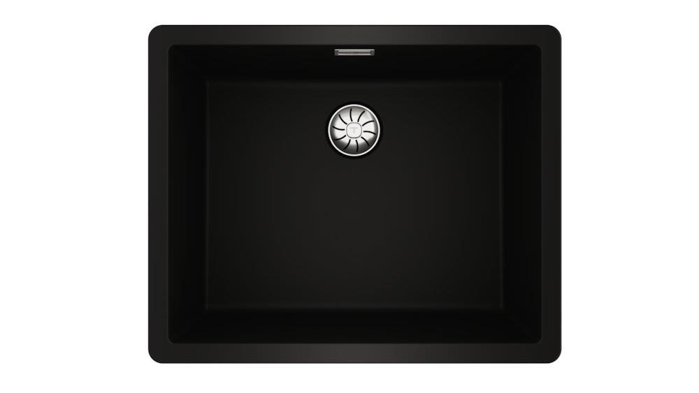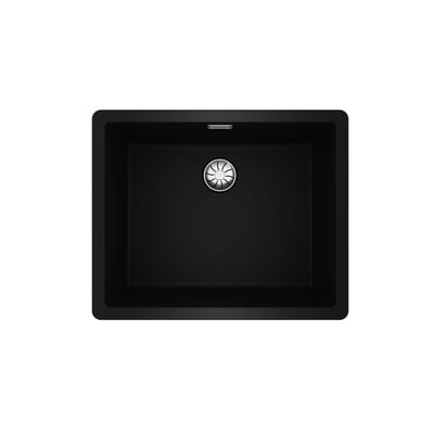Rektangulær enkeltkumme i sort granitkomposit med manuel kurveventil, firkantet overløb og strainer, velegnet til underlimning.
