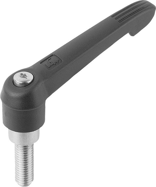 Spændehåndtag størrelse 4 med M12x30 gevind. Fremstillet i plast, sort/grå RAL 7021 og rustfrit stål.