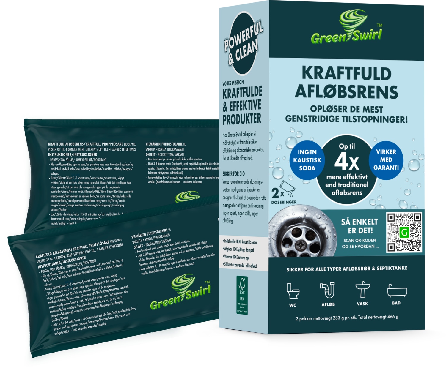 GreenSwirl er en yderst effektiv afløbsrens, der er designet til at håndtere selv de mest genstridige tilstopninger. Med en dokumenteret effekt, der er op til 4 gange højere end traditionelle afløbsrenseprodukter, opløser GreenSwirl hurtigt og sikkert fedt, hår og sæberester.