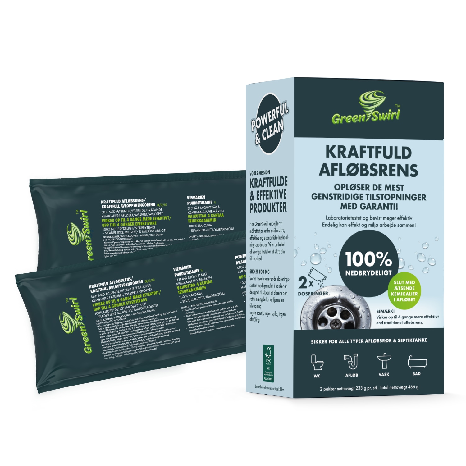 Kraftfuld og sikker afløbsrens fra GreenSwirl, der ikke skader miljøet. Indeholder 2 doseringsposer á 233 g. Mere effektiv end traditionel afløbsrens.