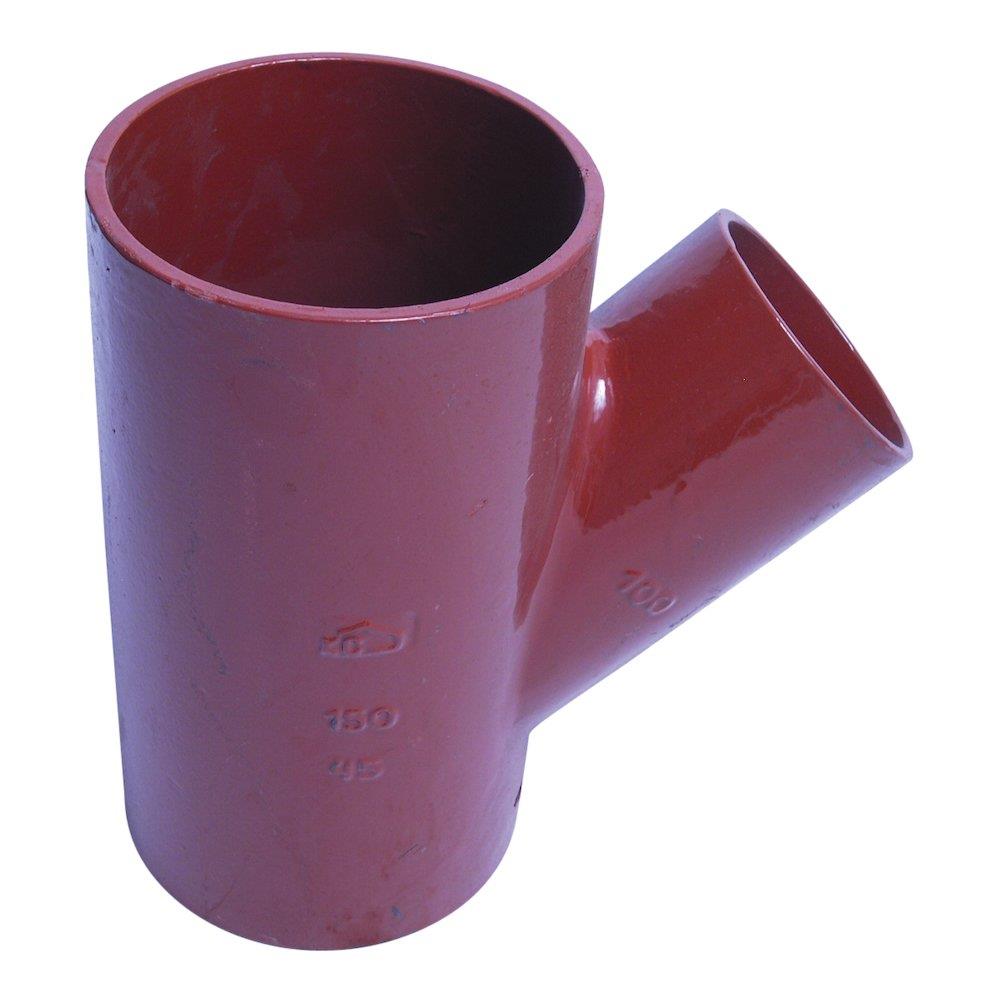Grenrør i støbejern med en vinkel på 45 grader. Dimensioner: 100mm til 80mm. Farve: rød. CE byggevareforordningen godkendt.