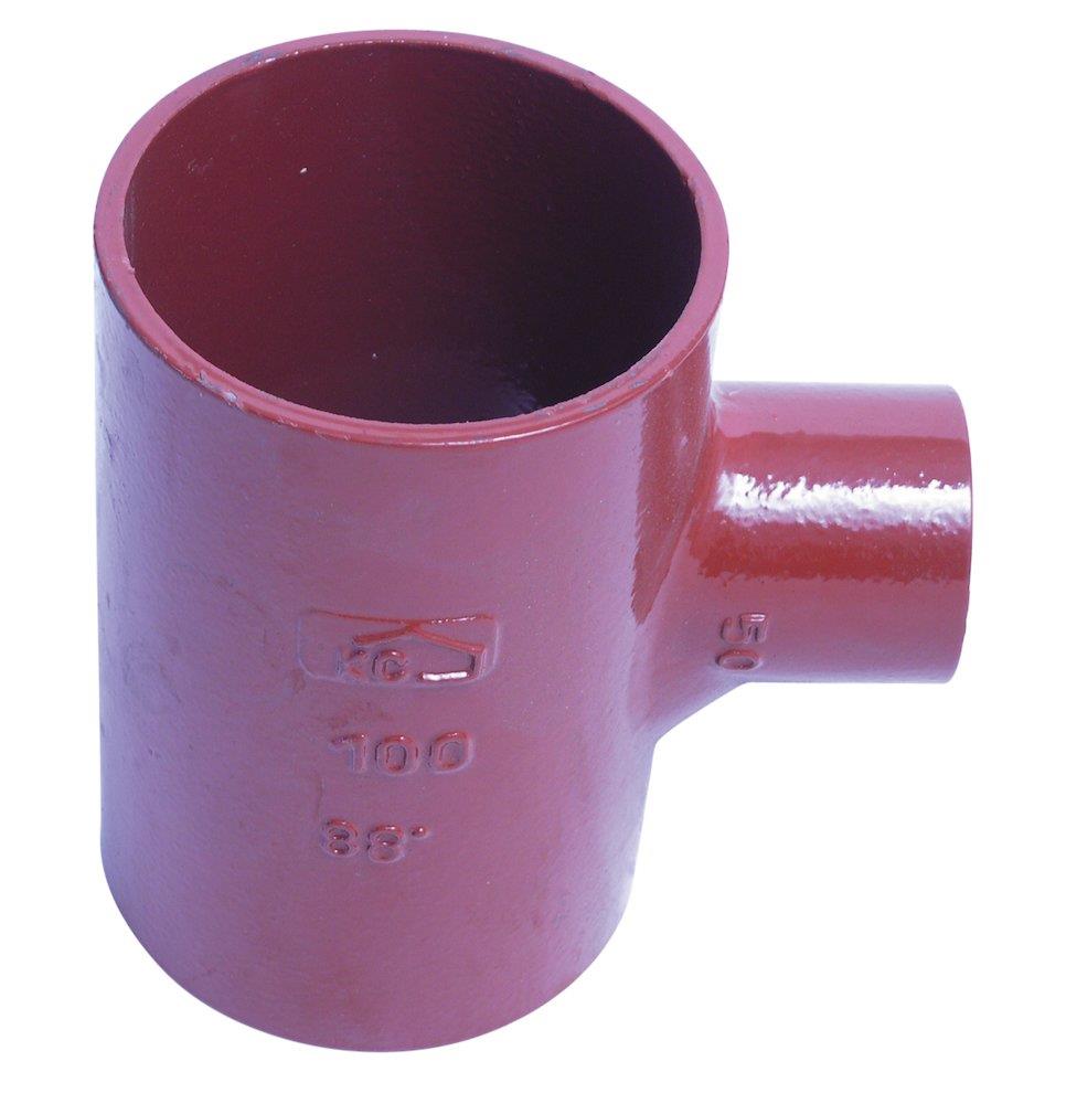 Dette grenrør er fremstillet af robust støbejern og har en rød finish. Det er designet til brug i afløbssystemer og er uden muffe.