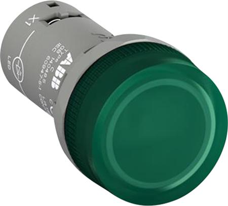 Grøn signallampe med sort plastikkrave og integreret LED. Designet til 110-130V AC og har en diameter på 22mm. Fra ABB's kompakte serie.