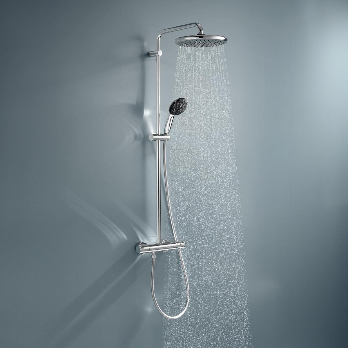 Grohe Vitalio Start System 250 brusesystem med termostat. Inkluderer en 390 mm svingbar brusearm, hovedbruser, håndbruser og 1,75m slange. Vandbesparende og med SafeStop funktion.