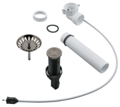 Praktisk afløbssæt med pop-up betjening i børstet hard graphite. Passer til alle køkkenvaske og er pladsbesparende.