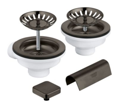 Dette afløbssæt fra GROHE er designet til køkkenvaske med 2 kummer og leveres i en elegant børstet hard graphite finish. Sættet er sammensat af flere komponenter for fuld funktionalitet.