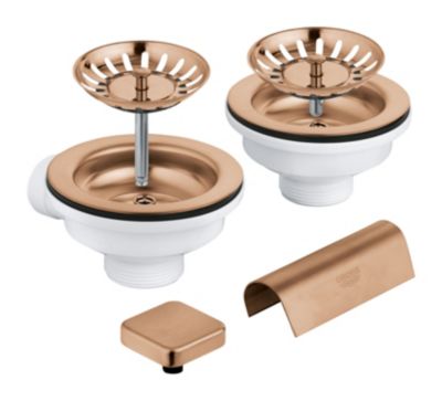 Dette afløbssæt fra GROHE er designet til køkkenvaske med to kummer og har en praktisk excenterfunktion samt overløb. Den eksklusive børstet Warm Sunset finish tilføjer et elegant touch til dit køkken.