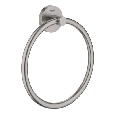 GROHE Essentials håndklæderingen er et stilrent og funktionelt tilbehør til badeværelset. Fremstillet af robust metal og med en elegant Supersteel finish, der giver et moderne og tidløst udtryk. Den børstede overflade bidrager til et sofistikeret look, der komplementerer enhver indretning.