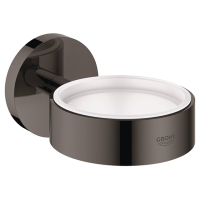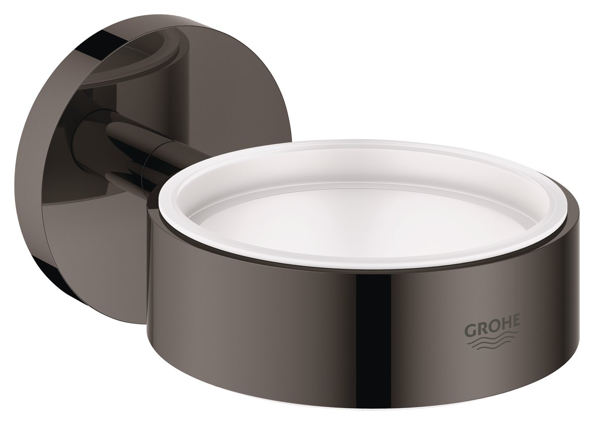 Denne holder fra Grohe Essentials er fremstillet i metal og har en poleret, antracit overflade med Grohe StarLight-finish. Den er designet til at rumme et krystalglas (varenr. 40 372 001), en sæbeskål (varenr. 40 368 001) eller en sæbedispenser (varenr. 40 394 001).