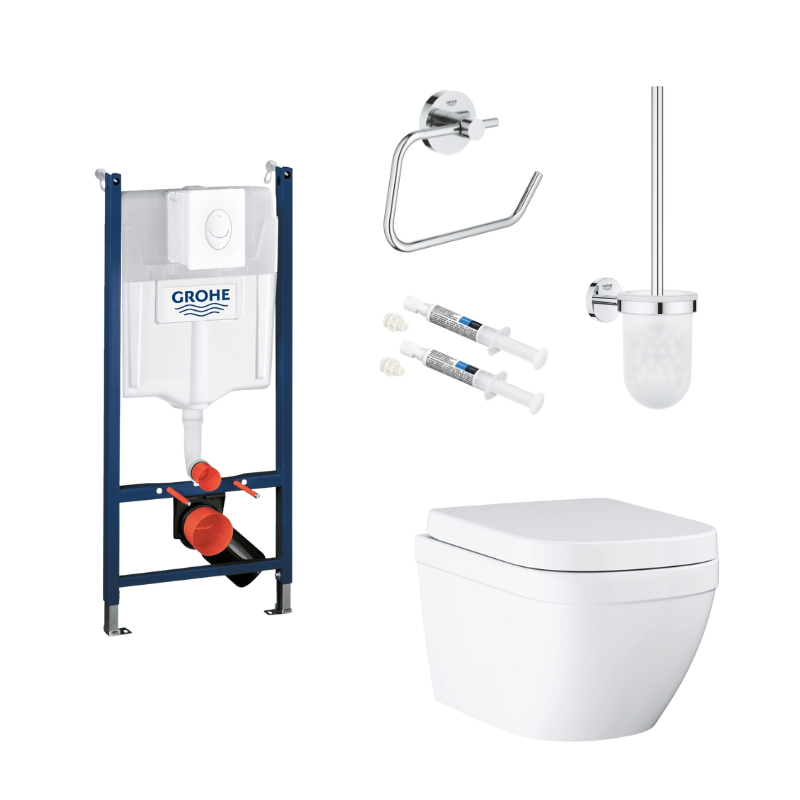 Komplet Grohe Euro toiletpakke med væghængt toilet, Rapid cisterne (113 cm) og trykplade. Inkl. SoftClose toiletsæde.